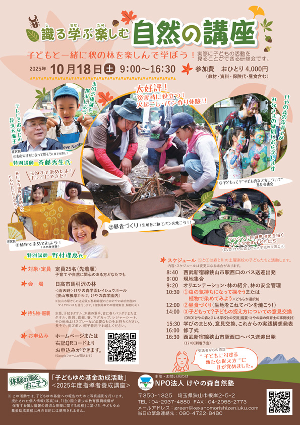 100名近くの受講者が集まり、狭山市市民交流センターと日高市馬引沢の林で自然の講座を開催しました。宮台真司先生のご講演の後、午後は林へ移動して飯盒を使用した炊飯、葉っぱで遊ぼう、昆虫と仲良くなろうなどのワークショップ、けやの森学園の実践発表などを行いました。受講後のアンケートでも飯盒炊飯や宮台真司先生の講演、実践発表など多くの内容に満足いただいた会となりました。アンケート結果を参考に来年度以降の内容も検討いたします。